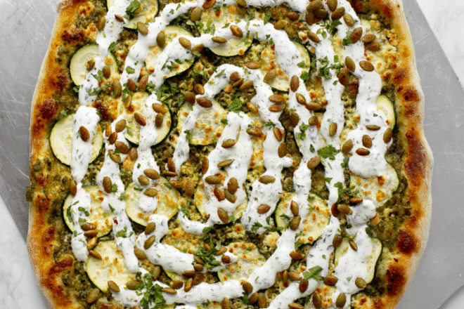 Poblano Pizza with Cilantro-Lime Crema and Toasted Pepitas